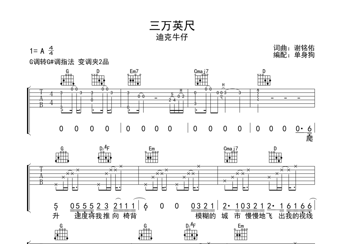 迪克牛仔《三万英尺》吉他谱 - G调弹唱六线谱