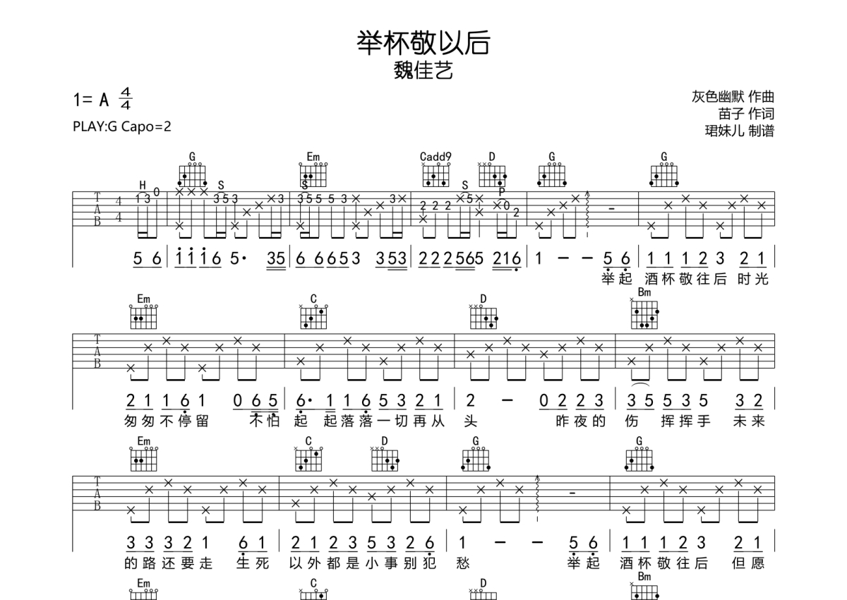 《举杯敬往后》是魏佳艺演唱的一首歌曲,拍号为4/4拍,歌曲速度为每分钟84拍,歌曲原调为A调,但由于原调指法比较难,为了方便弹奏,本吉他谱采用的是G调指法编配,变调夹2品弹奏即为原调,当然也可以根据自己的音域改变变调夹位置,或者通过改变和弦调性,以方便自己弹奏,这份吉他谱共有两张高清图谱,图谱由 @珺妹儿 编配上传,图谱使用六线谱编配,包含吉他和弦指法、简谱以及歌词部分,使用这份举杯敬往后吉他谱,可以让你更加方便地掌握这首歌曲的弹唱技巧,快来尝试吧。G调指法编配,弹唱建议变调夹2品,速度85难度较简单,易上手。