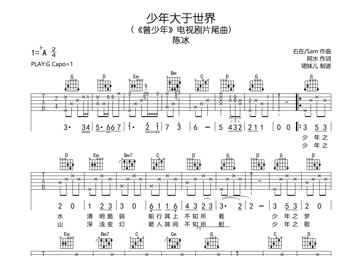 陈冰《少年大于世界》吉他谱 - G调弹唱六线谱