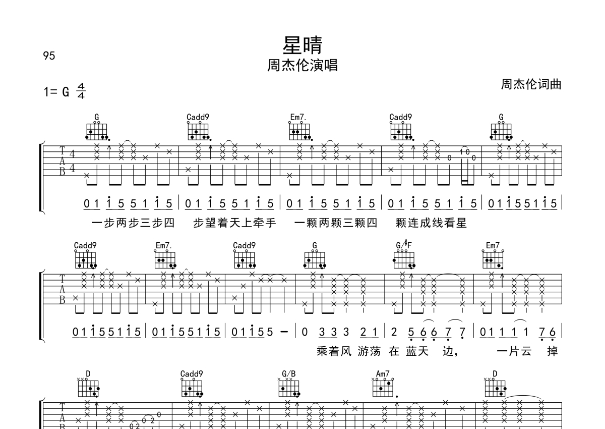 周杰伦《星晴》吉他谱 - G调弹唱六线谱