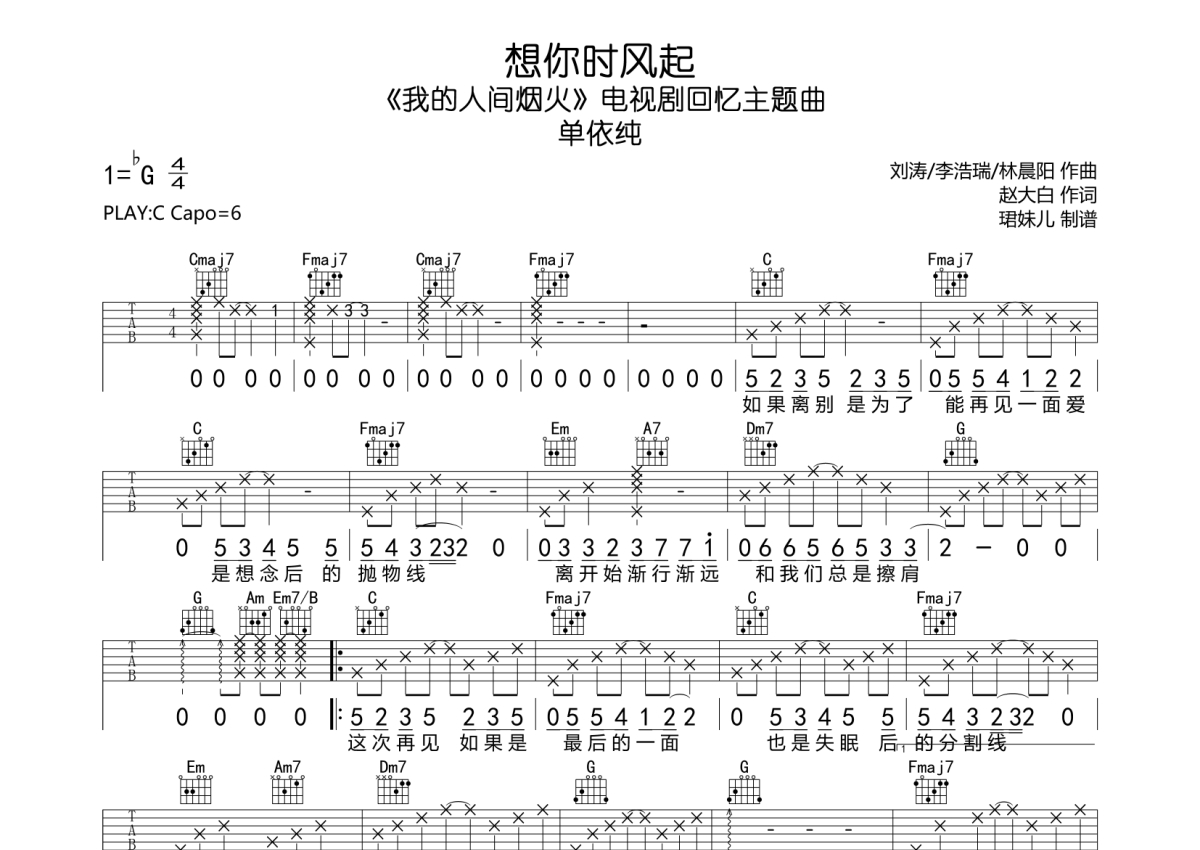 单依纯《想你时风起》吉他谱 - C调弹唱六线谱