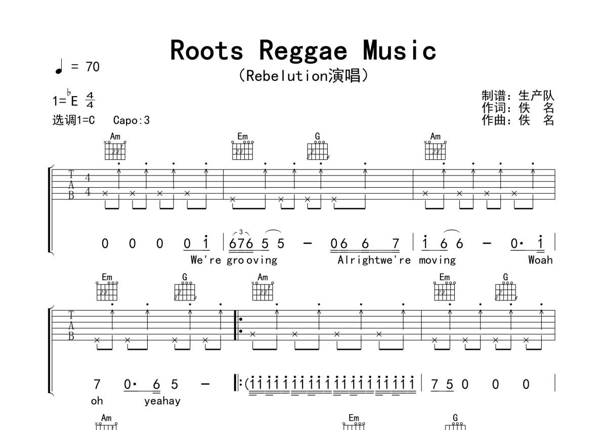 《Roots Reggae Music》是Rebelution演唱的一首歌曲,精编版,拍号为4/4拍,歌曲速度为每分钟70拍,歌曲原调为Eb调,但由于原调指法比较难,为了方便弹奏,本吉他谱采用的是C调指法编配,变调夹3品弹奏即为原调,当然也可以根据自己的音域改变变调夹位置,或者通过改变和弦调性,以方便自己弹奏,这份吉他谱共有四张高清图谱,图谱由 @生产队 编配上传,图谱使用六线谱编配,包含吉他和弦指法、简谱以及歌词部分,使用这份Roots Reggae Music吉他谱,可以让你更加方便地掌握这首歌曲的弹唱技巧,快来尝试吧。《Roots Reggae Music》是由Rebelution演唱的一首雷鬼风格歌曲。本吉他谱根据原版采用C调指法编配,本曲节奏感很棒,旋律朗朗上口,跟着节奏摇摆起来吧!地道的草根雷鬼音乐,值得推荐学习!。