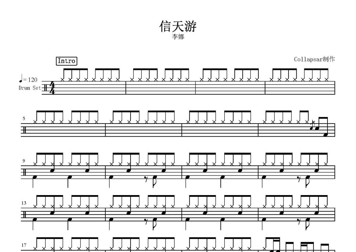 《信天游》是李娜演唱的一首歌曲,这份鼓谱共有四张高清图谱,图谱由 @打鼓谱 编配上传,图谱使用五线谱编配,使用这份信天游架子鼓谱,你将能够轻松地敲打出这首李娜的信天游,快来尝试吧。1。