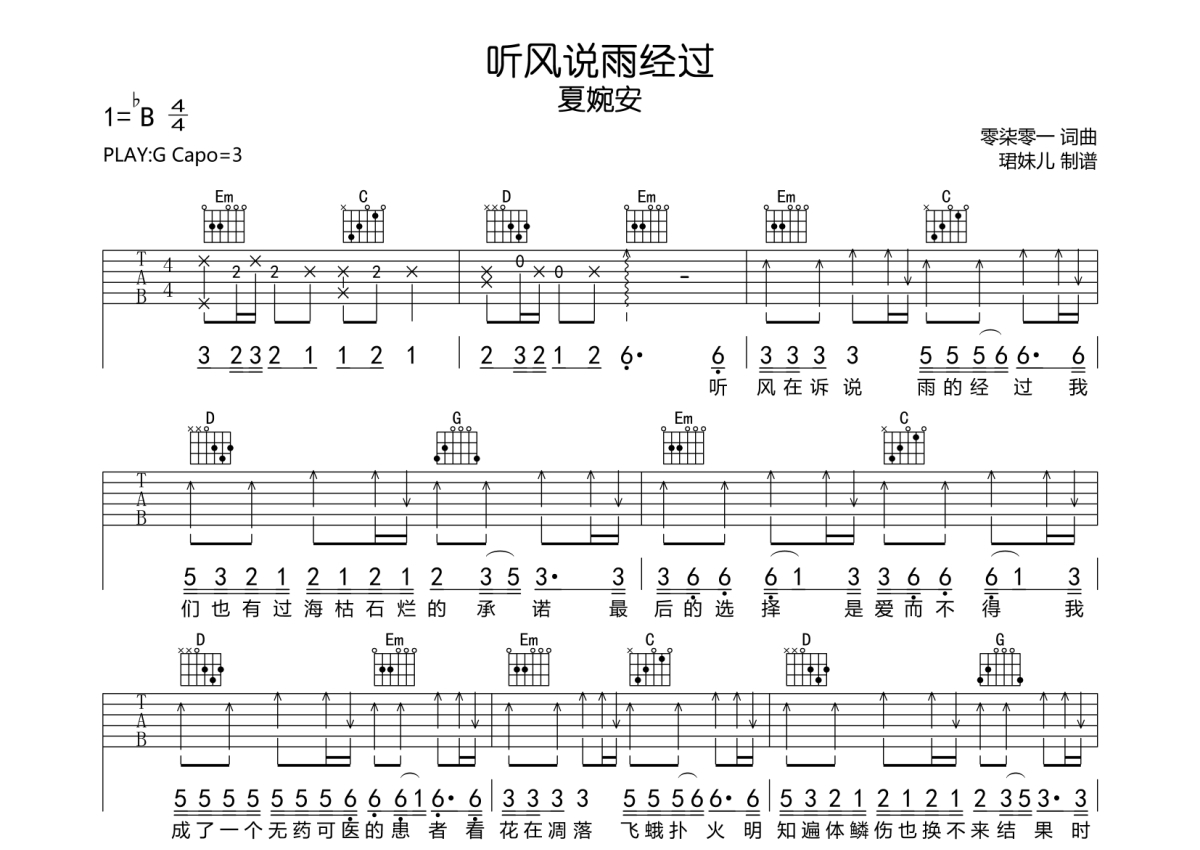 《听风说雨经过》是夏婉安演唱的一首歌曲,拍号为4/4拍,歌曲速度为每分钟84拍,歌曲原调为Bb调,但由于原调指法比较难,为了方便弹奏,本吉他谱采用的是G调指法编配,变调夹3品弹奏即为原调,当然也可以根据自己的音域改变变调夹位置,或者通过改变和弦调性,以方便自己弹奏,这份吉他谱共有两张高清图谱,图谱由 @珺妹儿 编配上传,图谱使用六线谱编配,包含吉他和弦指法、简谱以及歌词部分,使用这份听风说雨经过吉他谱,可以让你更加方便地掌握这首歌曲的弹唱技巧,快来尝试吧。