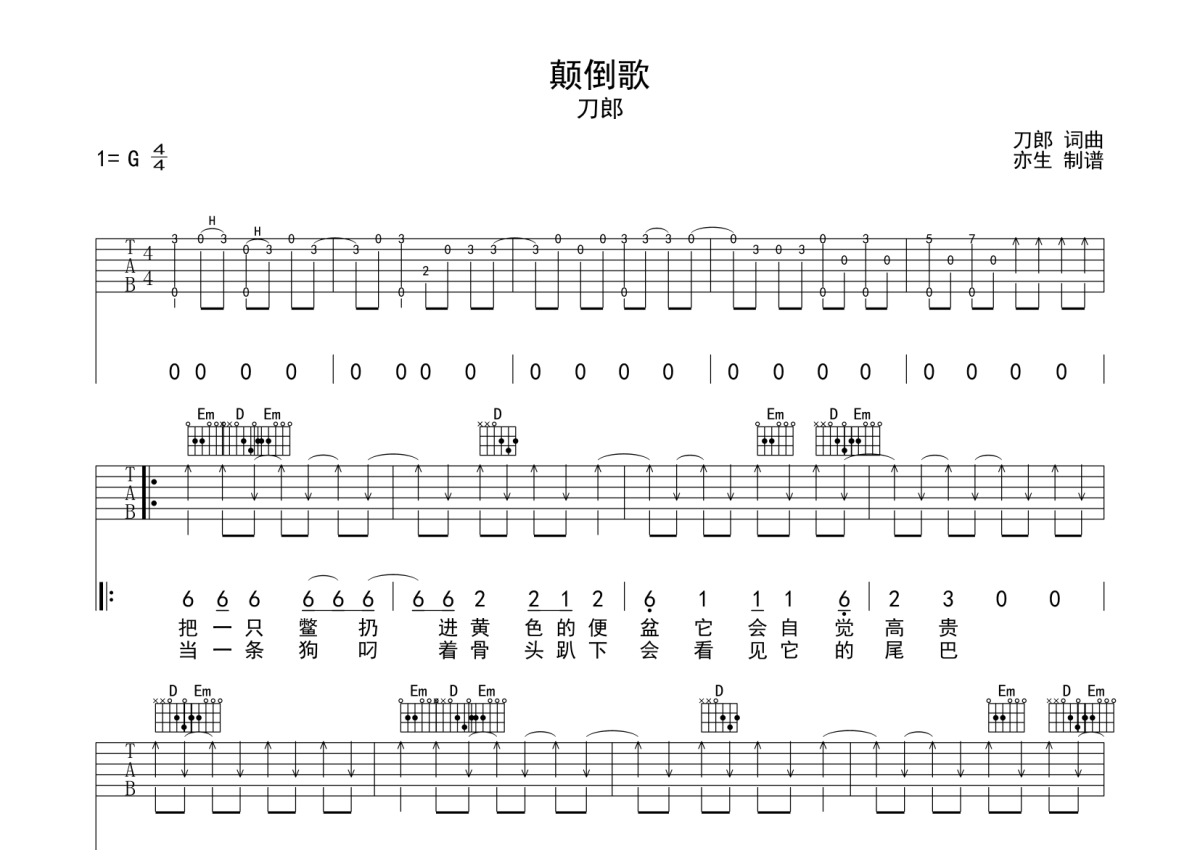 刀郎《颠倒歌》吉他谱 - G调弹唱六线谱