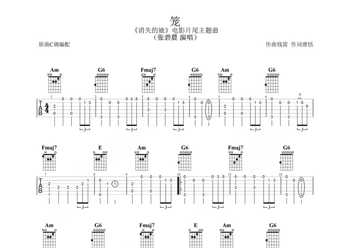 张碧晨《笼》吉他谱 - C调独奏六线谱