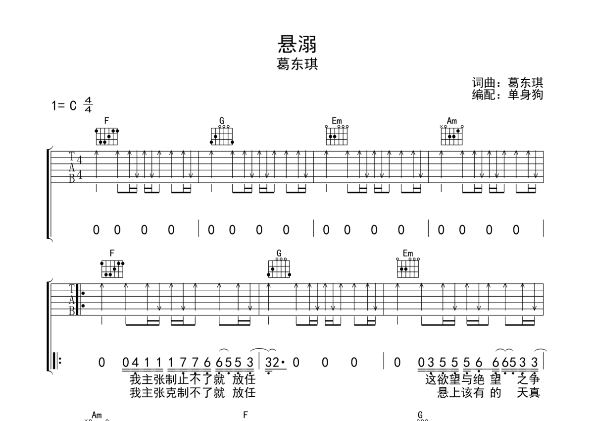 葛东琪《悬溺》吉他谱 - C调弹唱六线谱