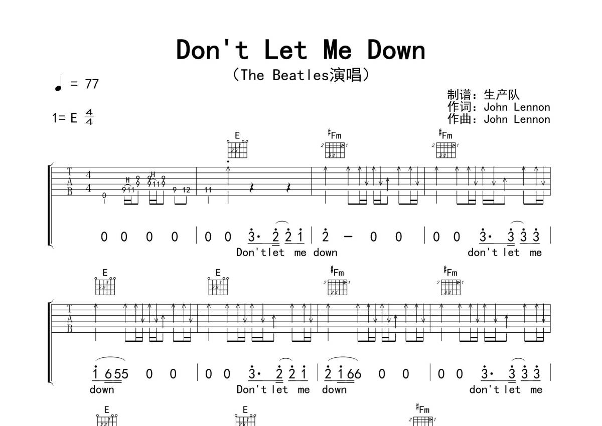 《Don't Let Me Down》是The Beatles演唱的一首歌曲,精编扫弦版,拍号为4/4拍,歌曲速度为每分钟77拍,歌曲原调为E调,但由于原调指法比较难,为了方便弹奏,本吉他谱采用的是E调指法编配,演奏时不需要使用变调夹即为原调,这份吉他谱共有三张高清图谱,图谱由 @生产队 编配上传,图谱使用六线谱编配,包含吉他和弦指法、简谱以及歌词部分,使用这份Don't Let Me Down吉他谱,可以让你更加方便地掌握这首歌曲的弹唱技巧,快来尝试吧。《Don't Let Me Down》是The Beatles (披头士)创作并演唱的一首歌曲。这首歌是约翰列侬写给自己的爱人小野洋子的,1969年4月发售。本吉他谱根据原版E调指法编配,扫弦节奏精编版,值得推荐的欧美金曲!。