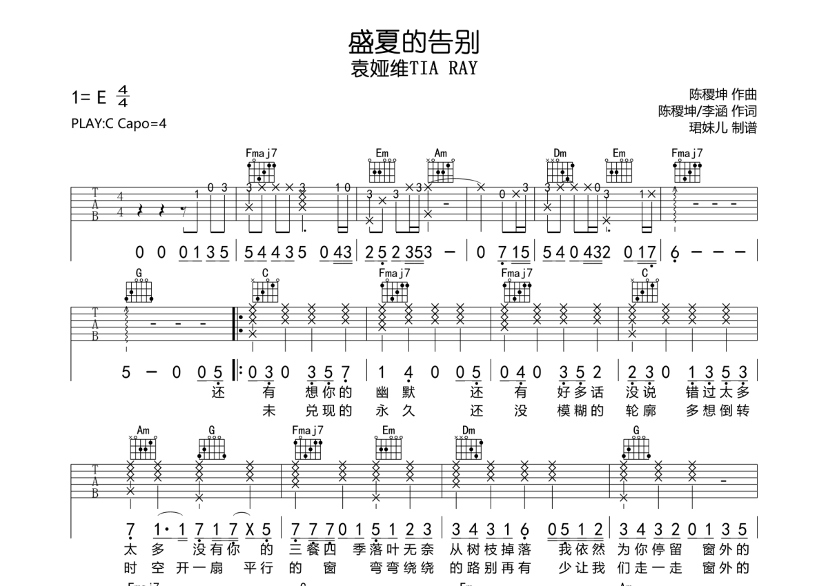 《盛夏的告别》是袁娅维演唱的一首歌曲,拍号为4/4拍,歌曲速度为每分钟84拍,歌曲原调为E调,但由于原调指法比较难,为了方便弹奏,本吉他谱采用的是C调指法编配,变调夹4品弹奏即为原调,当然也可以根据自己的音域改变变调夹位置,或者通过改变和弦调性,以方便自己弹奏,这份吉他谱共有两张高清图谱,图谱由 @珺妹儿 编配上传,图谱使用六线谱编配,包含吉他和弦指法、简谱以及歌词部分,使用这份盛夏的告别吉他谱,可以让你更加方便地掌握这首歌曲的弹唱技巧,快来尝试吧。