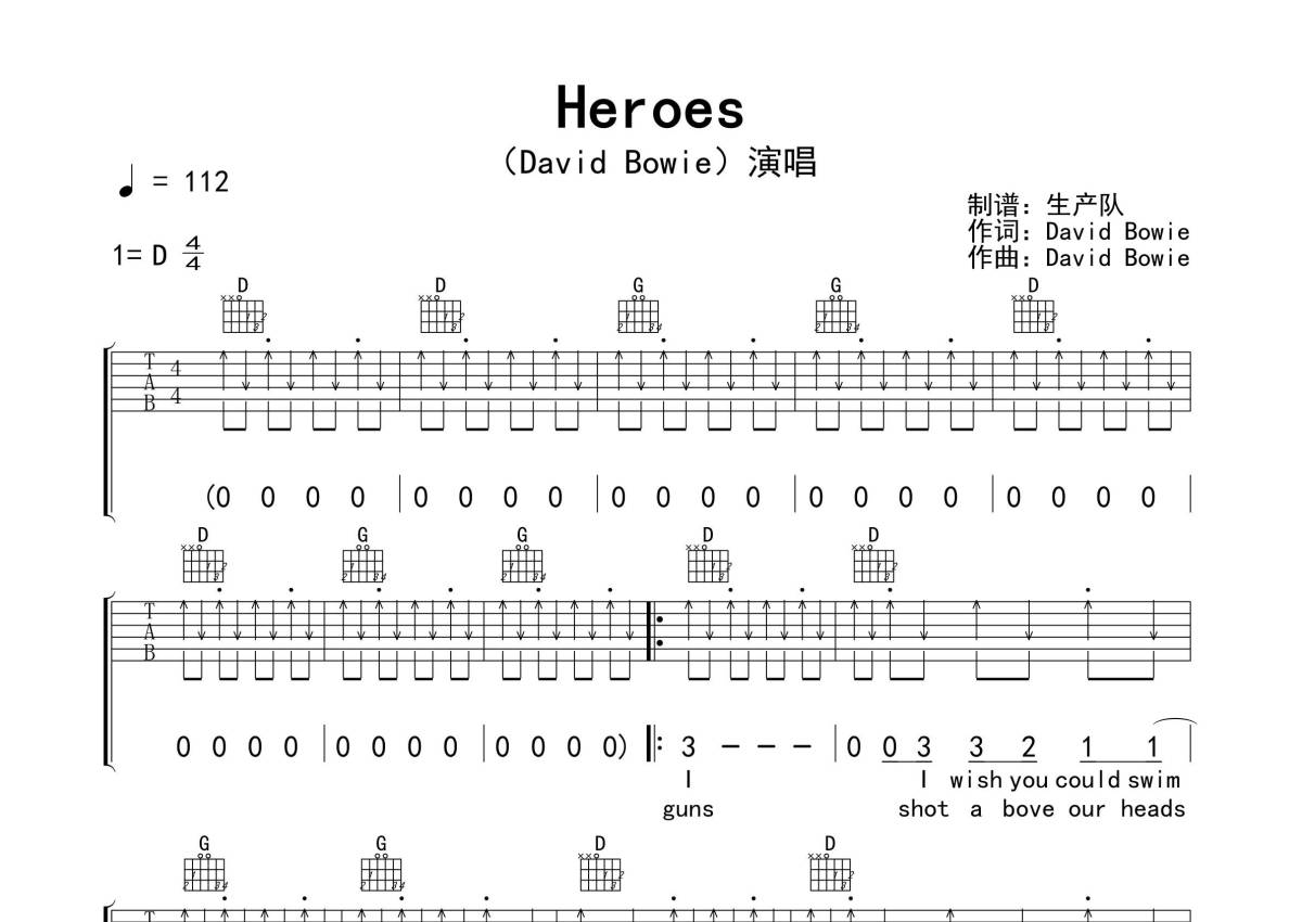《Heroes》是David Bowie演唱的一首歌曲,精编扫弦版,拍号为4/4拍,歌曲速度为每分钟112拍,歌曲原调为D调,但由于原调指法比较难,为了方便弹奏,本吉他谱采用的是D调指法编配,演奏时不需要使用变调夹即为原调,这份吉他谱共有三张高清图谱,图谱由 @生产队 编配上传,图谱使用六线谱编配,包含吉他和弦指法、简谱以及歌词部分,使用这份Heroes吉他谱,可以让你更加方便地掌握这首歌曲的弹唱技巧,快来尝试吧。《Heroes》是英国摇滚歌手David Bowie (大卫•鲍伊)演唱的一首经典歌曲,1999年,该曲获得BMI年度流行音乐奖 ,2021年,该曲被《滚石》杂志评为“史上最伟大的500首歌曲”之一。本吉他谱根据原版D调指法编配,扫弦切音节奏,效果很棒,值得推荐的欧美金曲!。