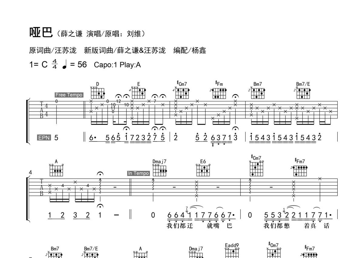 《哑巴》是薛之谦演唱的一首歌曲,拍号为4/4拍,歌曲速度为每分钟56拍,歌曲原调为Bb调,但由于原调指法比较难,为了方便弹奏,本吉他谱采用的是A调指法编配,变调夹1品弹奏即为原调,当然也可以根据自己的音域改变变调夹位置,或者通过改变和弦调性,以方便自己弹奏,这份吉他谱共有三张高清图谱,图谱由 @老杨教吉他 编配上传,图谱使用六线谱编配,包含吉他和弦指法、简谱以及歌词部分,曲谱配备了相关的视频提供浏览,使用这份哑巴吉他谱,可以让你更加方便地掌握这首歌曲的弹唱技巧,快来尝试吧。【调弦】标准调弦。 【基本信息】原曲bB调,选调A,变调夹夹1品,每分钟56拍。 【编配情况】根据原曲精细整理。 【难点】节奏的变化/不常用和弦的按法。 【技巧说明】Harm【自然泛音】。 视频演示>>>>>>https://www.bilibili.com/video/BV1it411p7Zf/ 讲解视频>>>>>>https://www.bilibili.com/video/BV1Et411W77v/。
