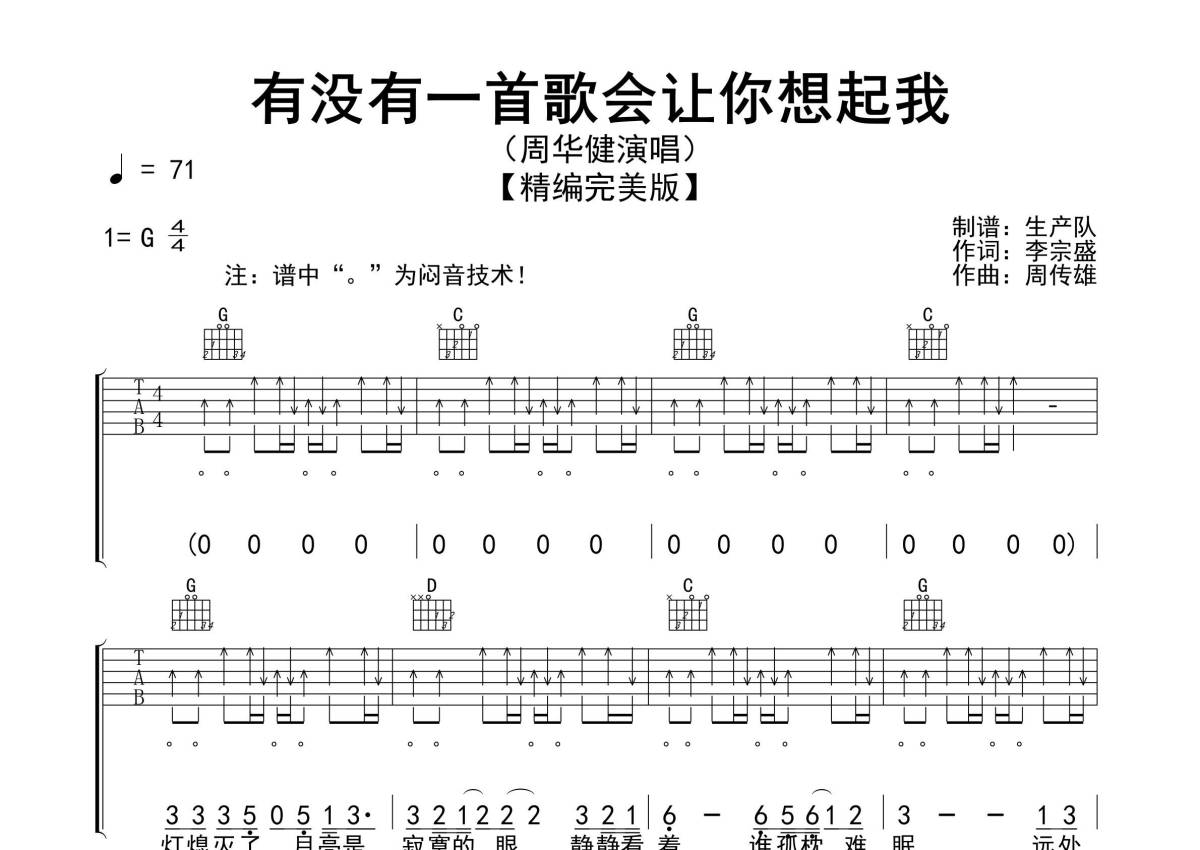 《有没有一首歌会让你想起我》是周华健演唱的一首歌曲,精编完美版,拍号为4/4拍,歌曲速度为每分钟71拍,歌曲原调为G调,本吉他谱采用的是G调指法编配,演奏时不需要使用变调夹即为原调,这份吉他谱共有三张高清图谱,图谱由 @生产队 编配上传,图谱使用六线谱编配,包含吉他和弦指法、简谱以及歌词部分,使用这份有没有一首歌会让你想起我吉他谱,可以让你更加方便地掌握这首歌曲的弹唱技巧,快来尝试吧。《有没有一首歌会让你想起我》是周华健演唱的一首歌曲,由李焯雄、李宗盛作词,周传雄作曲,2002年3月23日,该曲获第二届音乐风云榜颁奖盛典年度十大杰出金曲。本吉他谱根据原版G调指法编配,扫弦+闷音+切音节奏,精编完美版,值得推荐的经典歌曲!。