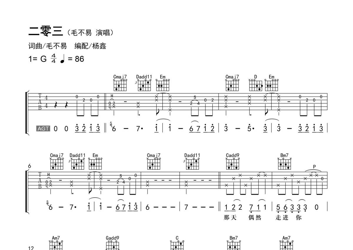 《二零三》是毛不易演唱的一首歌曲,精编弹唱,拍号为4/4拍,歌曲速度为每分钟86拍,歌曲原调为G调,本吉他谱采用的是G调指法编配,演奏时不需要使用变调夹即为原调,这份吉他谱共有三张高清图谱,图谱由 @老杨教吉他 编配上传,图谱使用六线谱编配,包含吉他和弦指法、简谱以及歌词部分,使用这份二零三吉他谱,可以让你更加方便地掌握这首歌曲的弹唱技巧,快来尝试吧。【调弦】标准调弦。 【基本信息】原曲G调,选调G,每分钟86拍。 【编配情况】根据原曲精细编配。 【难点】无。 【技巧说明】H为“击弦”;P为“勾弦”,S为“滑音”。