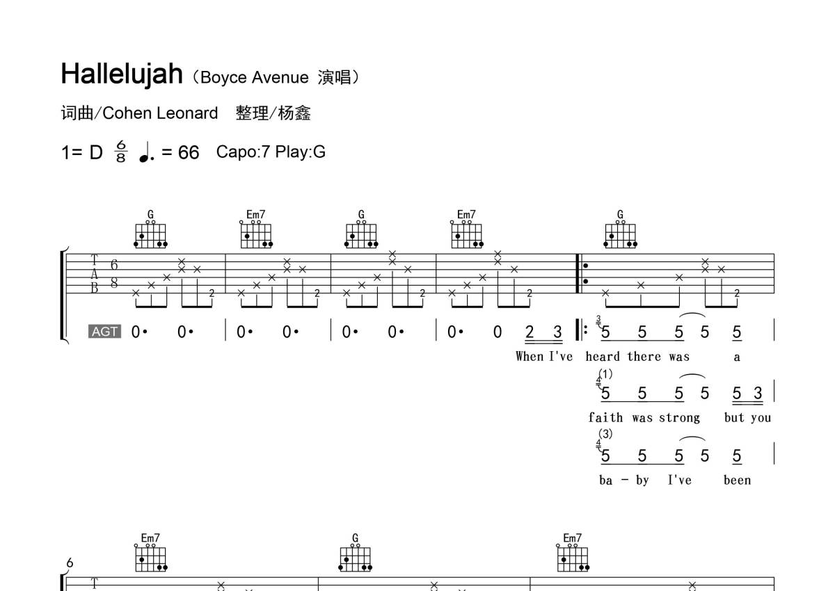 《Hallelujah(哈利路亚)》是Boyce Avenue演唱的一首歌曲,精编弹唱,拍号为6/8拍,歌曲速度为每分钟66拍,歌曲原调为D调,但由于原调指法比较难,为了方便弹奏,本吉他谱采用的是G调指法编配,这份吉他谱共有四张高清图谱,图谱由 @老杨教吉他 编配上传,图谱使用六线谱编配,包含吉他和弦指法、简谱以及歌词部分,使用这份Hallelujah(哈利路亚)吉他谱,可以让你更加方便地掌握这首歌曲的弹唱技巧,快来尝试吧。【调弦】标准调弦。 【基本信息】原曲D调,选调G,变调夹夹7品,每分钟66拍。 【编配情况】根据原曲精细整理。 【难点】无。 【技巧说明】H为击弦;P为勾弦。