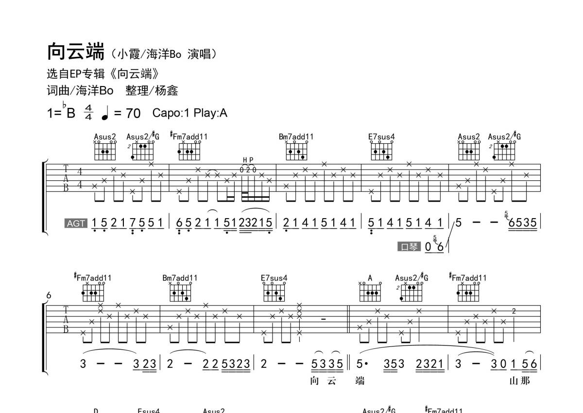 《向云端》是黄绮珊演唱的一首歌曲,精编弹唱,拍号为4/4拍,歌曲速度为每分钟70拍,歌曲原调为Bb调,但由于原调指法比较难,为了方便弹奏,本吉他谱采用的是A调指法编配,变调夹1品弹奏即为原调,当然也可以根据自己的音域改变变调夹位置,或者通过改变和弦调性,以方便自己弹奏,这份吉他谱共有四张高清图谱,图谱由 @老杨教吉他 编配上传,图谱使用六线谱编配,包含吉他和弦指法、简谱以及歌词部分,使用这份向云端吉他谱,可以让你更加方便地掌握这首歌曲的弹唱技巧,快来尝试吧。【调弦】标准调弦。 【基本信息】原曲bB调,选调A,变调夹夹1品,每分钟70拍。 【编配情况】根据原曲精细整理。 【和弦难度】和弦的特殊按法、大跨度按弦、拇指按弦、大横按和弦。 【节奏难度】最小时值32分音符,含切分节奏、含拍弦等吉他技巧。 【难点】节奏的变化,不常用和弦的转换。 【技巧说明】H为【击弦】、P为【勾弦】;拨弦带框为【拍弦】。
