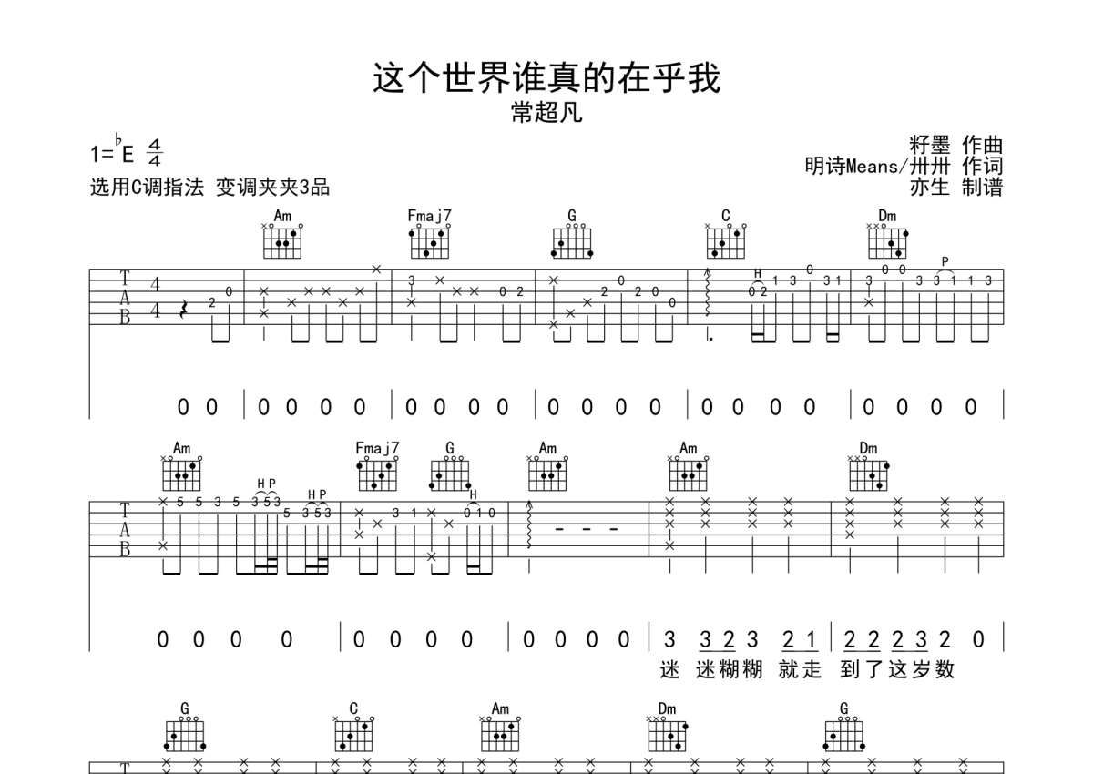 《这个世界谁真的在乎我》是常超凡演唱的一首歌曲,拍号为4/4拍,歌曲原调为Eb调,但由于原调指法比较难,为了方便弹奏,本吉他谱采用的是C调指法编配,变调夹3品弹奏即为原调,当然也可以根据自己的音域改变变调夹位置,或者通过改变和弦调性,以方便自己弹奏,这份吉他谱共有三张高清图谱,图谱由 @亦生 编配上传,图谱使用六线谱编配,包含吉他和弦指法、简谱以及歌词部分,使用这份这个世界谁真的在乎我吉他谱,可以让你更加方便地掌握这首歌曲的弹唱技巧,快来尝试吧。