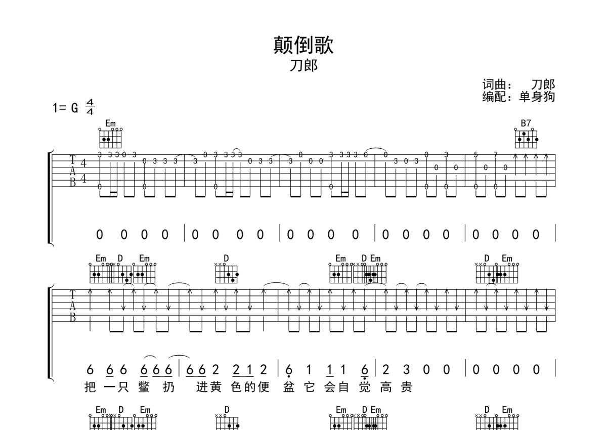 《颠倒歌》是刀郎演唱的一首歌曲,拍号为4/4拍,歌曲原调为G调,本吉他谱采用的是G调指法编配,演奏时不需要使用变调夹即为原调,这份吉他谱共有三张高清图谱,图谱由 @单身狗 编配上传,图谱使用六线谱编配,包含吉他和弦指法、简谱以及歌词部分,使用这份颠倒歌吉他谱,可以让你更加方便地掌握这首歌曲的弹唱技巧,快来尝试吧。