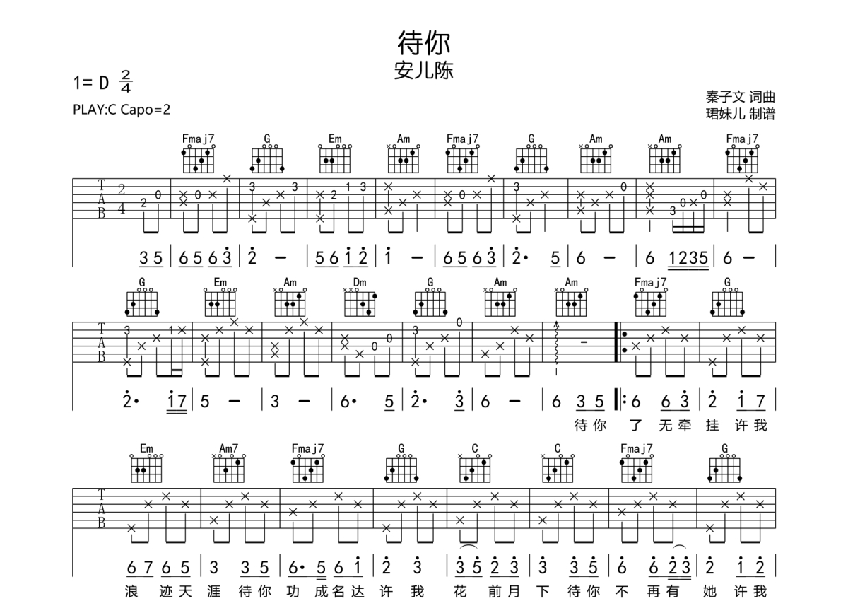 安儿陈《待你》吉他谱 - C调弹唱六线谱