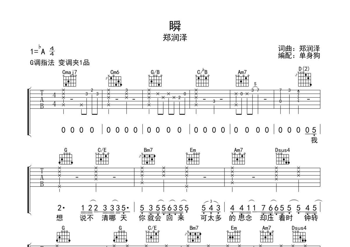 郑润泽《瞬》吉他谱 - G调弹唱六线谱