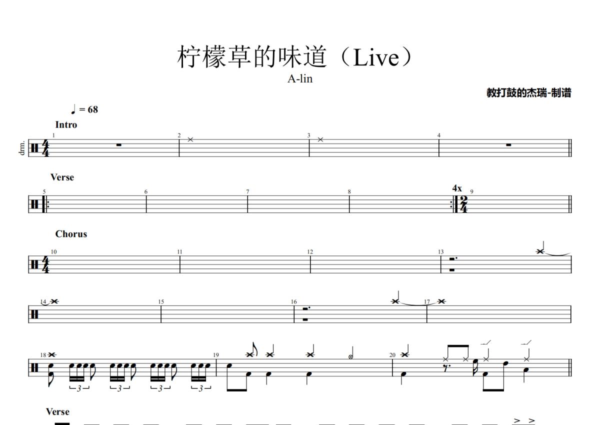 A-lin《柠檬草的味道(Live)》鼓谱 - 架子鼓谱 - 我是歌手第三季 总决赛