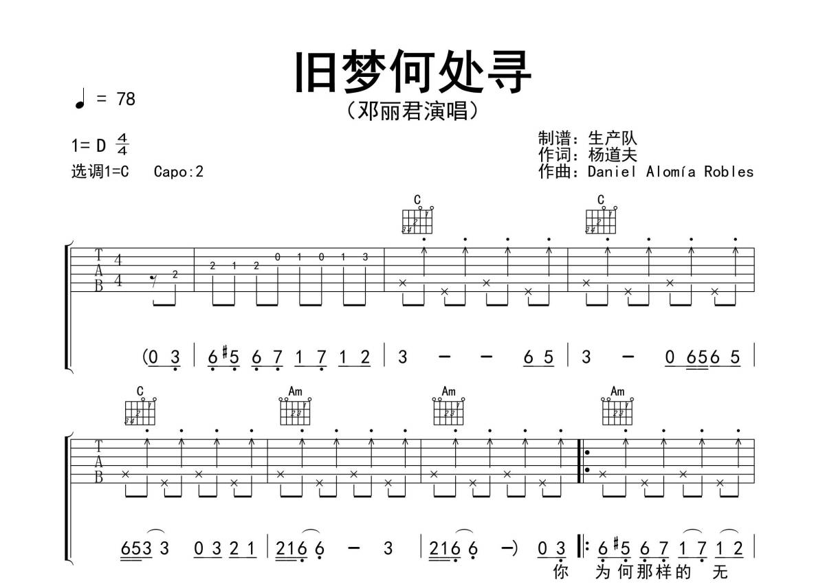 《旧梦何处寻》是邓丽君演唱的一首歌曲,精编完美版,拍号为4/4拍,歌曲速度为每分钟78拍,歌曲原调为D调,但由于原调指法比较难,为了方便弹奏,本吉他谱采用的是C调指法编配,变调夹2品弹奏即为原调,当然也可以根据自己的音域改变变调夹位置,或者通过改变和弦调性,以方便自己弹奏,这份吉他谱共有三张高清图谱,图谱由 @生产队 编配上传,图谱使用六线谱编配,包含吉他和弦指法、简谱以及歌词部分,使用这份旧梦何处寻吉他谱,可以让你更加方便地掌握这首歌曲的弹唱技巧,快来尝试吧。《旧梦何处寻》是邓丽君演唱的歌曲。本吉他谱根据原版采用C调指法编配,精准的前奏、间奏、尾奏,原版雷鬼节奏编配,值得推荐的经典歌曲!。