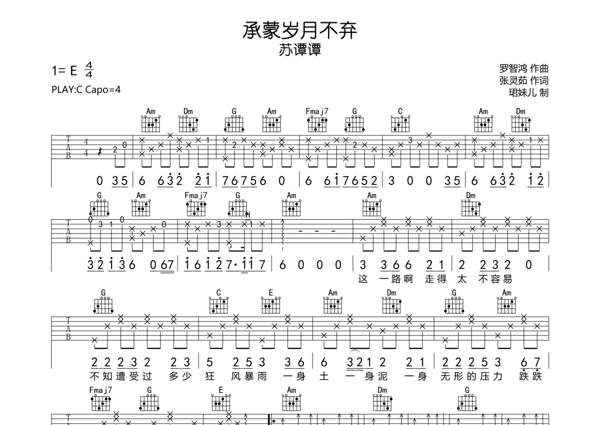 《承蒙岁月不弃》是苏谭谭演唱的一首歌曲,拍号为4/4拍,歌曲速度为每分钟85拍,歌曲原调为E调,但由于原调指法比较难,为了方便弹奏,本吉他谱采用的是C调指法编配,变调夹4品弹奏即为原调,当然也可以根据自己的音域改变变调夹位置,或者通过改变和弦调性,以方便自己弹奏,这份吉他谱共有两张高清图谱,图谱由 @珺妹儿 编配上传,图谱使用六线谱编配,包含吉他和弦指法、简谱以及歌词部分,使用这份承蒙岁月不弃吉他谱,可以让你更加方便地掌握这首歌曲的弹唱技巧,快来尝试吧。
