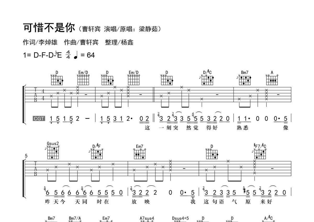 《可惜不是你》是曹轩宾演唱的一首歌曲,精编弹唱,歌曲速度为每分钟64拍,歌曲原调为D调,但由于原调指法比较难,为了方便弹奏,本吉他谱采用的是D调指法编配,演奏时不需要使用变调夹即为原调,这份吉他谱共有四张高清图谱,图谱由 @老杨教吉他 编配上传,图谱使用六线谱编配,包含吉他和弦指法、简谱以及歌词部分,使用这份可惜不是你吉他谱,可以让你更加方便地掌握这首歌曲的弹唱技巧,快来尝试吧。【调弦】标准调弦。 【基本信息】原曲D转F转D转bE调,选调D转F转D转bE调,变调夹夹0品,每分钟64拍。 【编配情况】根据原曲精细整理。 【和弦难度】和弦的特殊按法、不常用和弦、大跨度和弦、大横按。 【节奏难度】最小时值16分音符;含附点、切分节奏。 【难点】间奏的指法安排;节奏的变化;不常用和弦的按法与节奏的配合。 【技巧说明】P为【勾弦】。