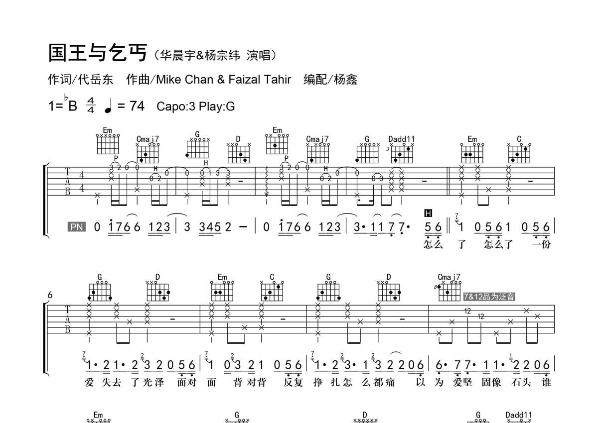 《国王与乞丐》是杨宗纬/华晨宇演唱的一首歌曲,精编弹唱,拍号为4/4拍,歌曲速度为每分钟74拍,歌曲原调为Bb调,但由于原调指法比较难,为了方便弹奏,本吉他谱采用的是G调指法编配,变调夹3品弹奏即为原调,当然也可以根据自己的音域改变变调夹位置,或者通过改变和弦调性,以方便自己弹奏,这份吉他谱共有四张高清图谱,图谱由 @老杨教吉他 编配上传,图谱使用六线谱编配,包含吉他和弦指法、简谱以及歌词部分,使用这份国王与乞丐吉他谱,可以让你更加方便地掌握这首歌曲的弹唱技巧,快来尝试吧。