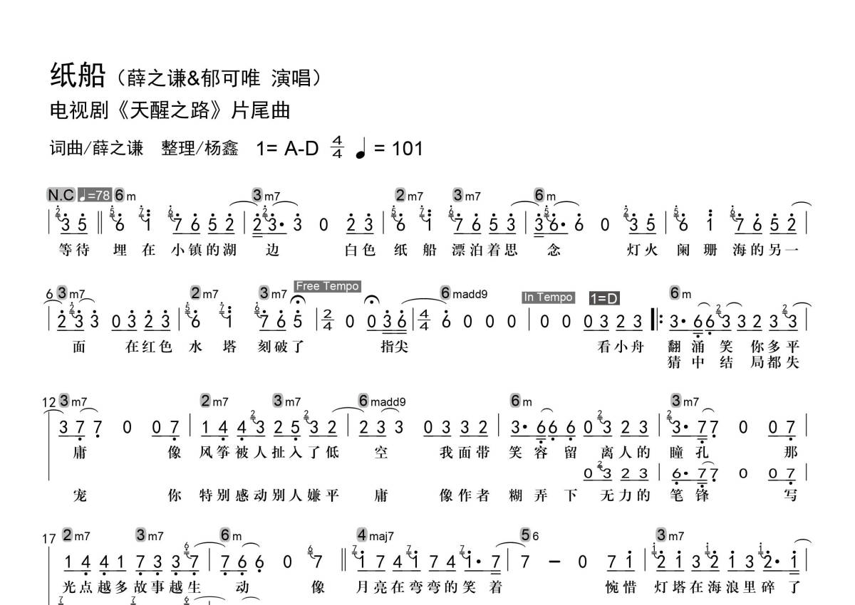 《纸船》是薛之谦/郁可唯演唱的一首歌曲,级数和弦标记,拍号为4/4拍,歌曲速度为每分钟101拍,这份简谱共有两张高清图谱,图谱由 @老杨教吉他 编配上传。