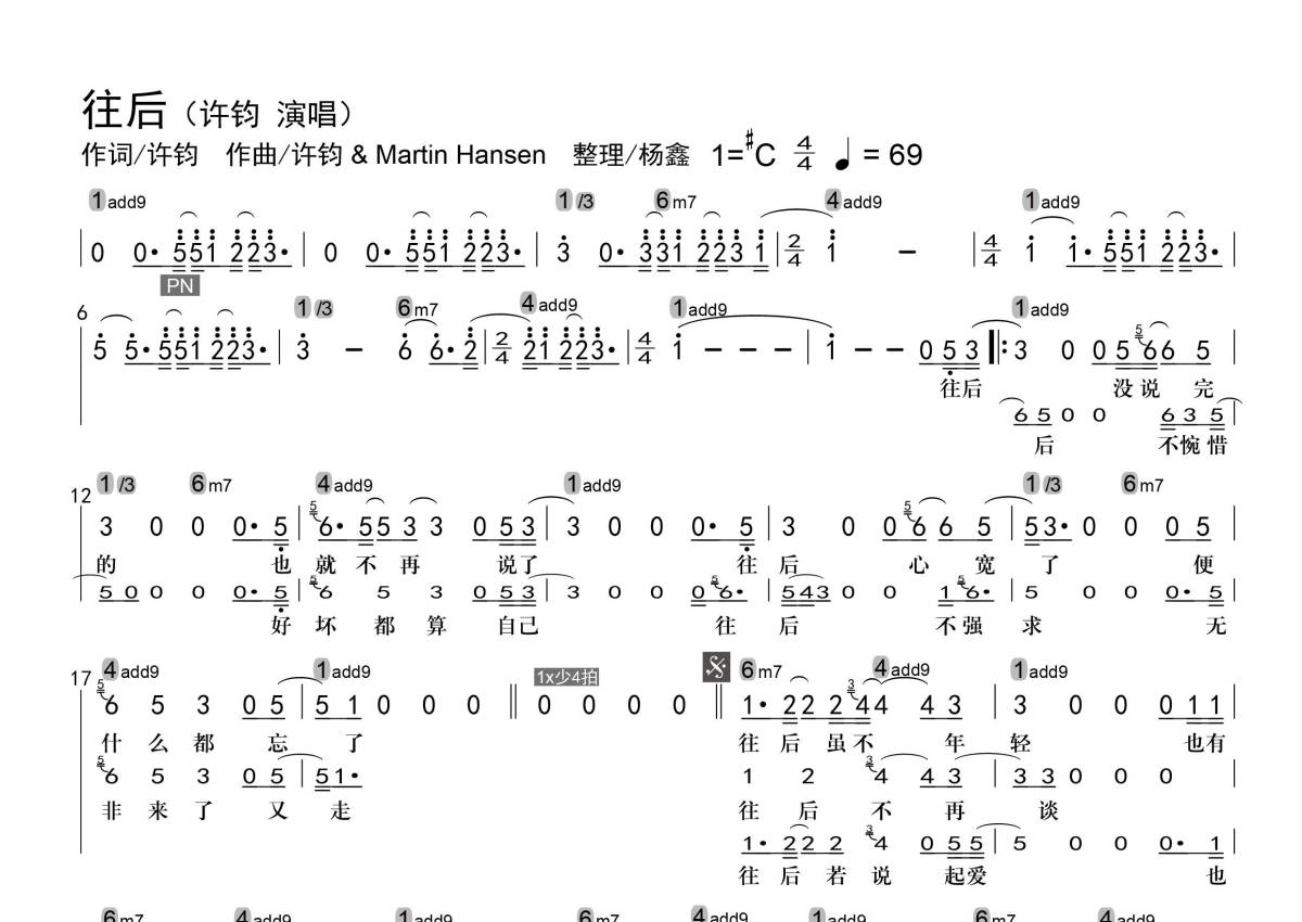 《往后》是许钧演唱的一首歌曲,级数和弦标记,拍号为4/4拍,歌曲速度为每分钟69拍,这份简谱共有一张高清图谱,图谱由 @老杨教吉他 编配上传。