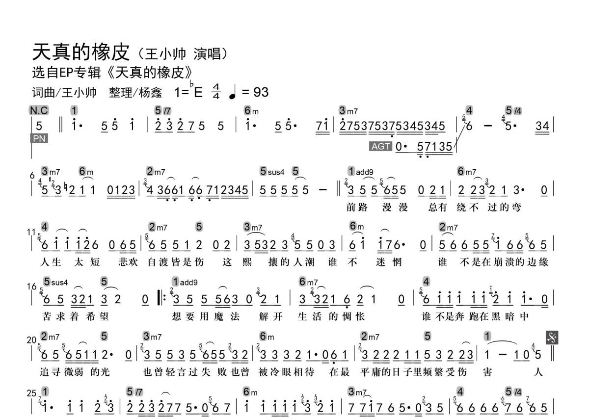 《天真的橡皮》是王小帅演唱的一首歌曲,级数和弦标记,这份简谱共有一张高清图谱,图谱由 @老杨教吉他 编配上传。