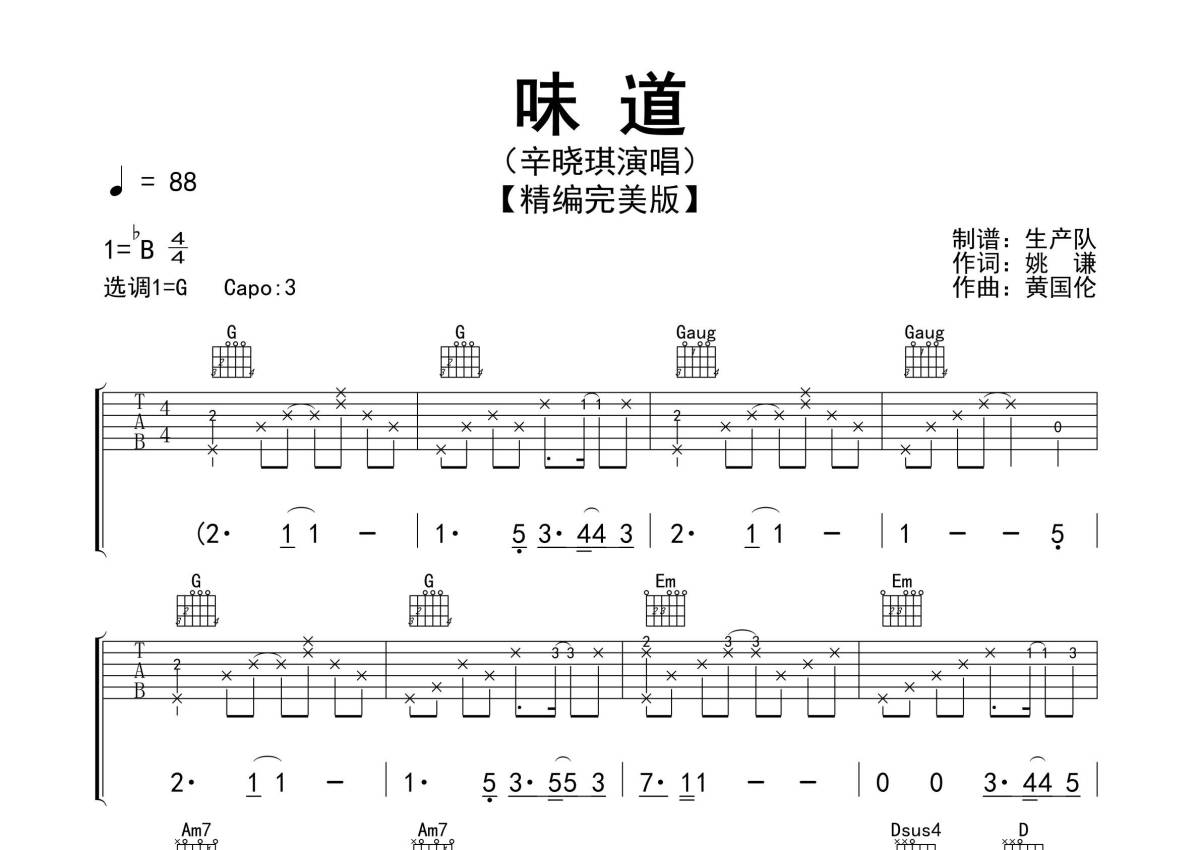 《味道》是辛晓琪演唱的一首歌曲,精编完美版,本吉他谱采用的是G调指法编配,这份吉他谱共有三张高清图谱,图谱由 @生产队 编配上传,图谱使用六线谱编配,包含吉他和弦指法、简谱以及歌词部分,使用这份味道吉他谱,可以让你更加方便地掌握这首歌曲的弹唱技巧,快来尝试吧。《味道》是由黄国伦作曲,姚谦作词,辛晓琪演唱的歌曲,收录于辛晓琪1994年12月29日发行的专辑《味道》中,1996年,该曲获得第18届十大中文金曲优秀国语歌曲奖金奖 。本吉他谱根据原版采用G调指法编配,精准的前奏、间奏、尾奏编配,值得推荐学习的经典作品!。