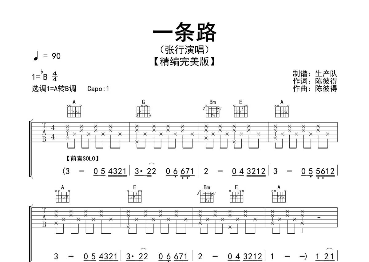《一条路》是张行演唱的一首歌曲,精编完美版,拍号为4/4拍,歌曲速度为每分钟90拍,歌曲原调为Bb调,但由于原调指法比较难,为了方便弹奏,本吉他谱采用的是A调指法编配,变调夹1品弹奏即为原调,当然也可以根据自己的音域改变变调夹位置,或者通过改变和弦调性,以方便自己弹奏,这份吉他谱共有三张高清图谱,图谱由 @生产队 编配上传,图谱使用六线谱编配,包含吉他和弦指法、简谱以及歌词部分,使用这份一条路吉他谱,可以让你更加方便地掌握这首歌曲的弹唱技巧,快来尝试吧。《一条路》是由陈彼得作词、作曲,张行演唱的歌曲。本吉他谱根据原版采用A调转B调指法编配,精准的前奏、间奏、尾奏及SOLO编配,一音不差版,值得推荐学习的经典歌曲!。