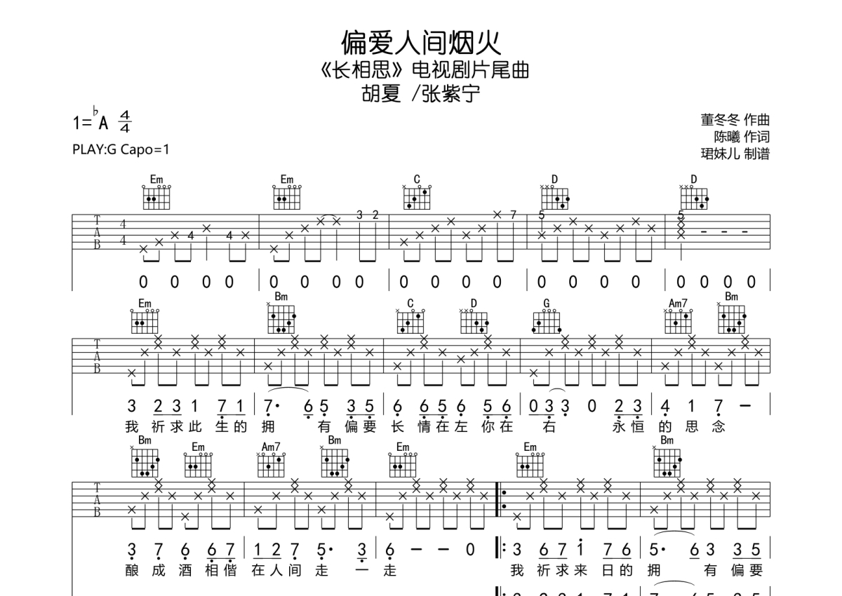 胡夏 /张紫宁《偏爱人间烟火》吉他谱 - G调弹唱六线谱