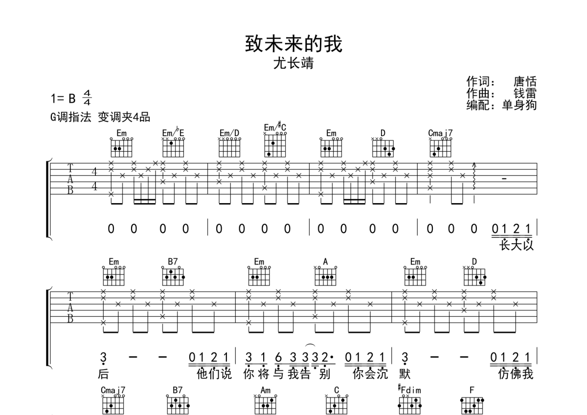 《致未来的我》是尤长靖演唱的一首歌曲,拍号为4/4拍,歌曲原调为B调,但由于原调指法比较难,为了方便弹奏,本吉他谱采用的是G调指法编配,变调夹4品弹奏即为原调,当然也可以根据自己的音域改变变调夹位置,或者通过改变和弦调性,以方便自己弹奏,这份吉他谱共有四张高清图谱,图谱由 @单身狗 编配上传,图谱使用六线谱编配,包含吉他和弦指法、简谱以及歌词部分,使用这份致未来的我吉他谱,可以让你更加方便地掌握这首歌曲的弹唱技巧,快来尝试吧。