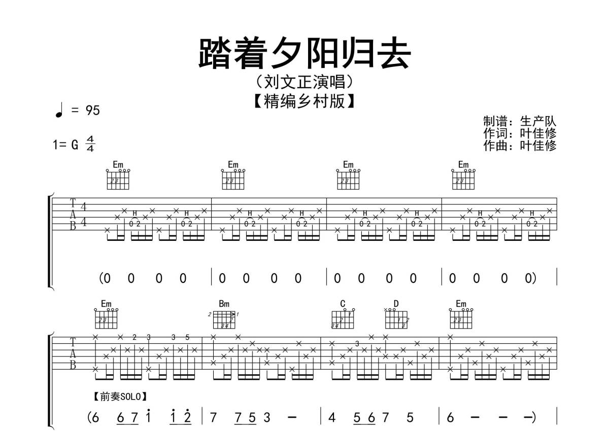 《踏着夕阳归去》是刘文正演唱的一首歌曲,精编乡村版,拍号为4/4拍,歌曲速度为每分钟95拍,歌曲原调为G调,本吉他谱采用的是G调指法编配,演奏时不需要使用变调夹即为原调,这份吉他谱共有三张高清图谱,图谱由 @生产队 编配上传,图谱使用六线谱编配,包含吉他和弦指法、简谱以及歌词部分,使用这份踏着夕阳归去吉他谱,可以让你更加方便地掌握这首歌曲的弹唱技巧,快来尝试吧。《踏着夕阳归去》是由叶佳修作词、作曲,刘文正演唱的歌曲,这是一首充满乡间旋律的歌曲,节奏愉快,令人产生一种舒适的听觉,其歌词优美,仿佛为我们描绘了一幅美不胜收的画卷,让人如临其境。本吉他谱根据原版G调指法编配,精准的前奏、间奏、尾奏及SOLO编配,乡村节奏注意低音的变化效果,值得推荐学习的经典乡村歌曲!。