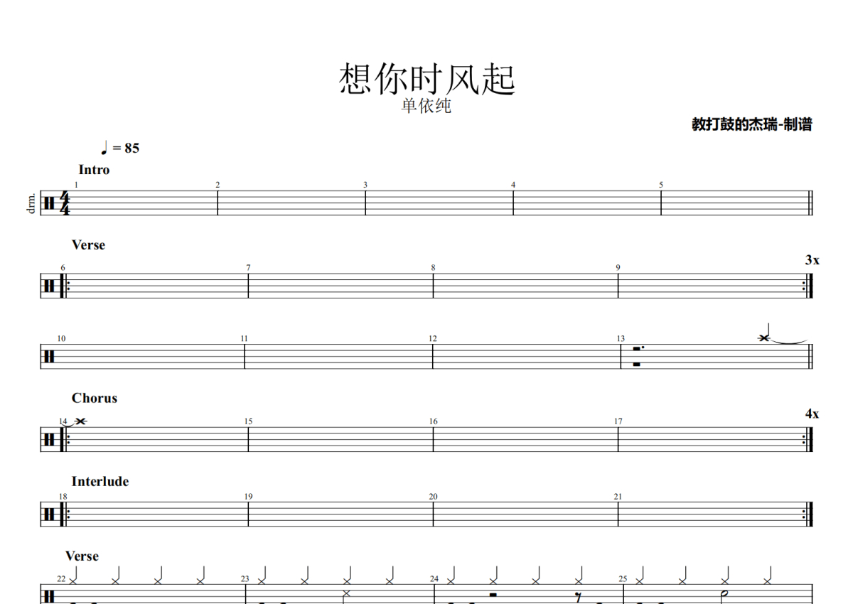单依纯《想你时风起》鼓谱 - 架子鼓谱