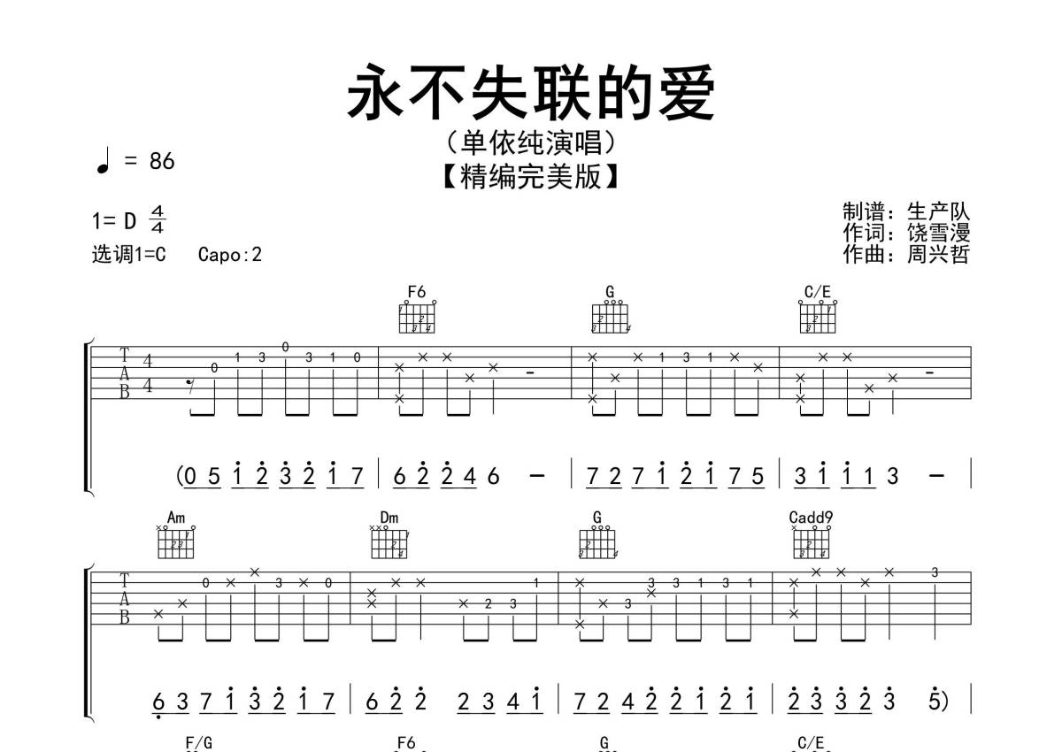 《永不失联的爱》是单依纯演唱的一首歌曲,精编完美版,拍号为4/4拍,歌曲速度为每分钟86拍,歌曲原调为D调,但由于原调指法比较难,为了方便弹奏,本吉他谱采用的是C调指法编配,变调夹2品弹奏即为原调,当然也可以根据自己的音域改变变调夹位置,或者通过改变和弦调性,以方便自己弹奏,这份吉他谱共有三张高清图谱,图谱由 @生产队 编配上传,图谱使用六线谱编配,包含吉他和弦指法、简谱以及歌词部分,使用这份永不失联的爱吉他谱,可以让你更加方便地掌握这首歌曲的弹唱技巧,快来尝试吧。《永不失联的爱》是由饶雪漫作词,周兴哲作曲,单依纯演唱的歌曲,也是电影《明天你是否依然爱我》的推广曲,发行于2020年12月22日,收录于同名专辑《永不失联的爱》中。本吉他谱根据原版采用C调指法编配,完整的前奏、间奏、尾奏,是一首值得推荐学习的民谣佳作!。