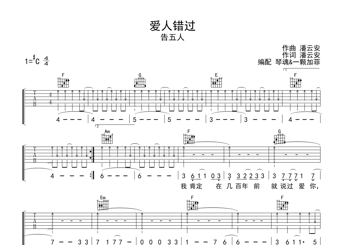 告五人《爱人错过》吉他谱 - C调弹唱六线谱