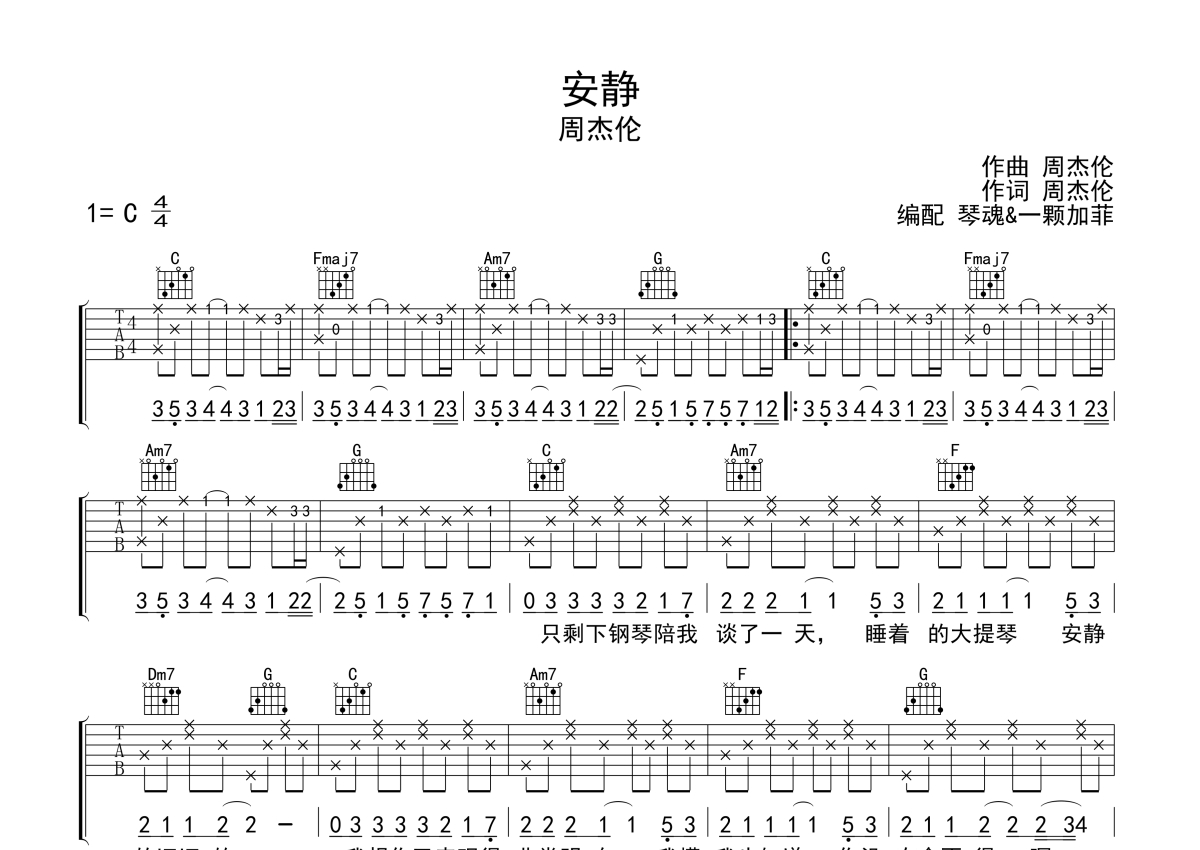 周杰伦《安静》吉他谱 - C调弹唱六线谱