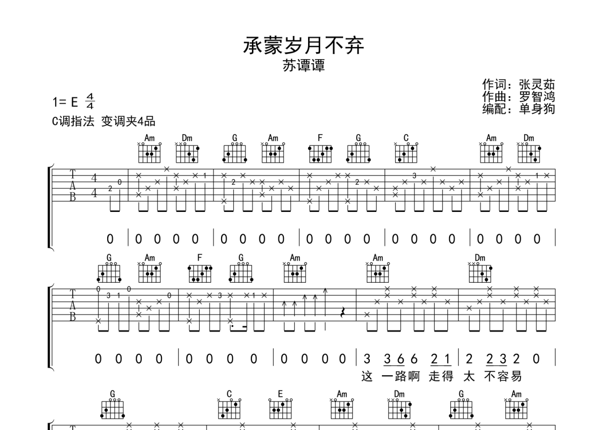 《承蒙岁月不弃》是苏谭谭演唱的一首歌曲,拍号为4/4拍,歌曲原调为E调,但由于原调指法比较难,为了方便弹奏,本吉他谱采用的是C调指法编配,变调夹4品弹奏即为原调,当然也可以根据自己的音域改变变调夹位置,或者通过改变和弦调性,以方便自己弹奏,这份吉他谱共有三张高清图谱,图谱由 @单身狗 编配上传,图谱使用六线谱编配,包含吉他和弦指法、简谱以及歌词部分,使用这份承蒙岁月不弃吉他谱,可以让你更加方便地掌握这首歌曲的弹唱技巧,快来尝试吧。