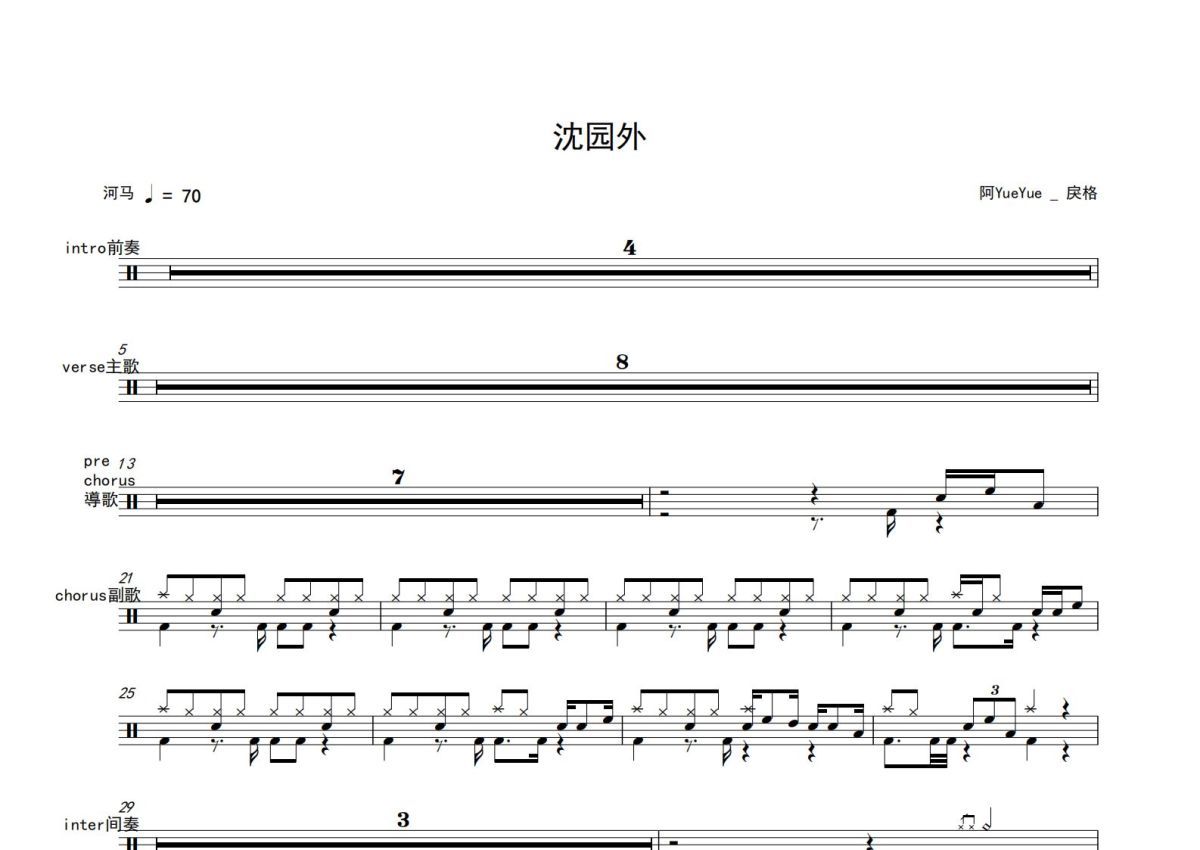 阿YueYue/戾格/小田音乐社《沈园外》鼓谱 - 架子鼓谱