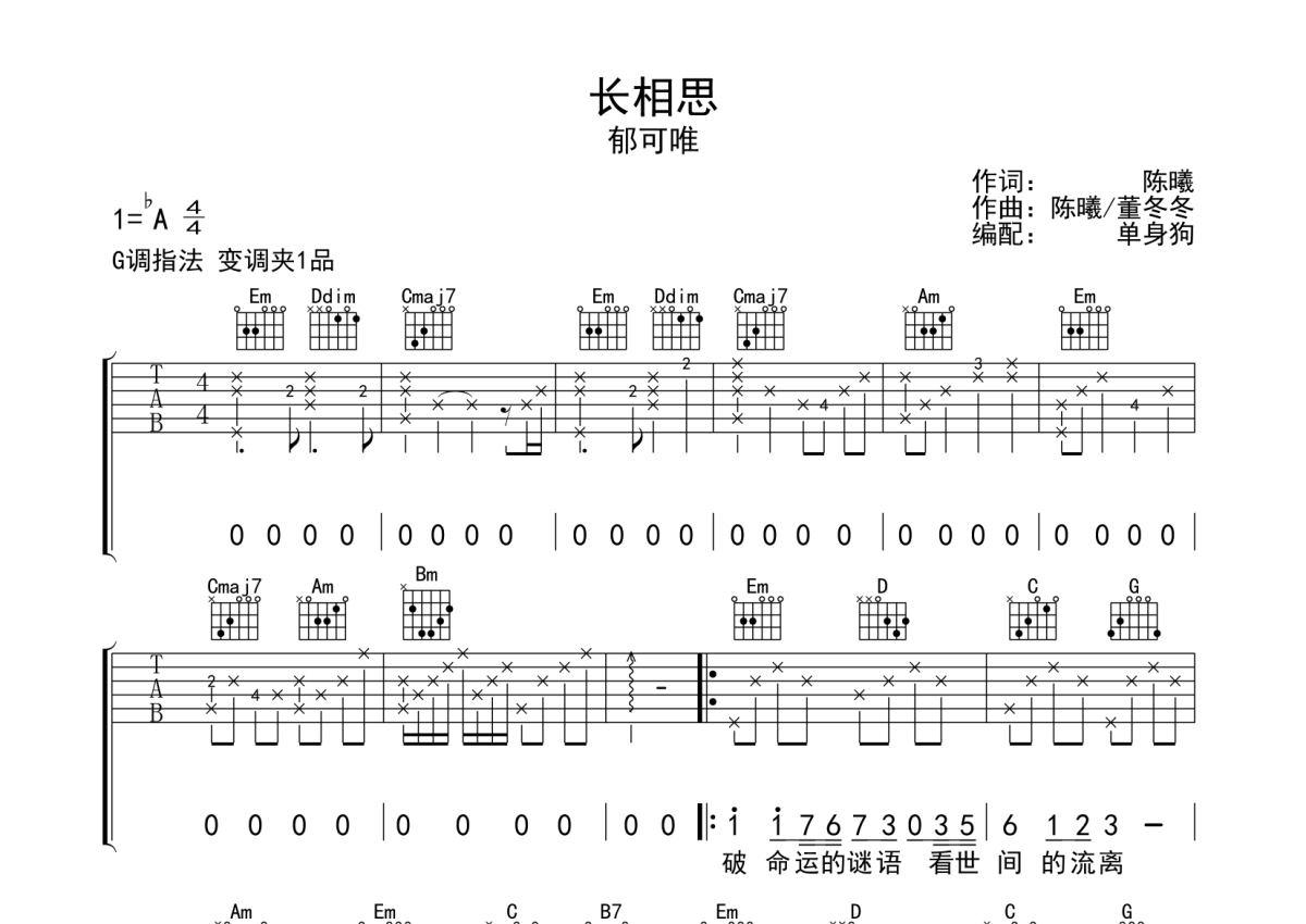 《长相思》是郁可唯演唱的一首歌曲,拍号为4/4拍,歌曲原调为Ab调,但由于原调指法比较难,为了方便弹奏,本吉他谱采用的是G调指法编配,变调夹1品弹奏即为原调,当然也可以根据自己的音域改变变调夹位置,或者通过改变和弦调性,以方便自己弹奏,这份吉他谱共有三张高清图谱,图谱由 @单身狗 编配上传,图谱使用六线谱编配,包含吉他和弦指法、简谱以及歌词部分,使用这份长相思吉他谱,可以让你更加方便地掌握这首歌曲的弹唱技巧,快来尝试吧。