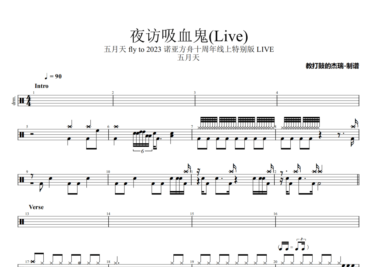 五月天《夜访吸血鬼(Live)》鼓谱 - 架子鼓谱 - 五月天 fly to 2023 诺亚方舟十周年线上特别版 LIVE