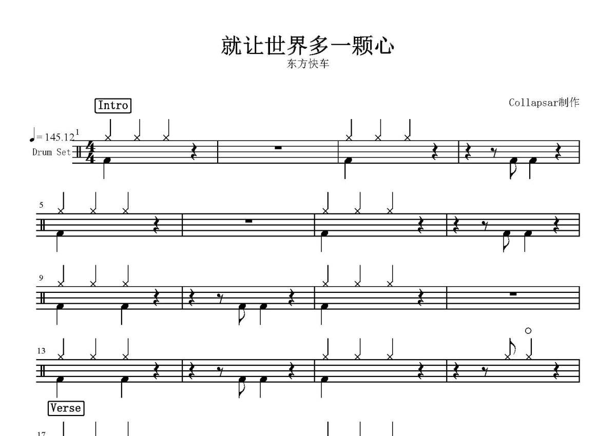 《就让世界多一颗心》是东方快车演唱的一首歌曲,这份鼓谱共有四张高清图谱,图谱由 @打鼓谱 编配上传,图谱使用五线谱编配,使用这份就让世界多一颗心架子鼓谱,你将能够轻松地敲打出这首东方快车的就让世界多一颗心,快来尝试吧。由姚可杰、杨振华、盛子贞、郭名虎、侯志坚五个志同道合的青年组成的“东方快车”合唱团,是台湾歌坛最早的偶像摇滚组合之一。1986年他们就曾荣获台湾“最具特色的合唱团体”大奖,紧接着他们推出了个人首张专辑《让世界多一颗心》。迄今为止,这首主打歌《让世界多一颗心》仍有许多歌迷痴爱不已,它既是“东方快车”的成名作,也是他们的代表作之一。