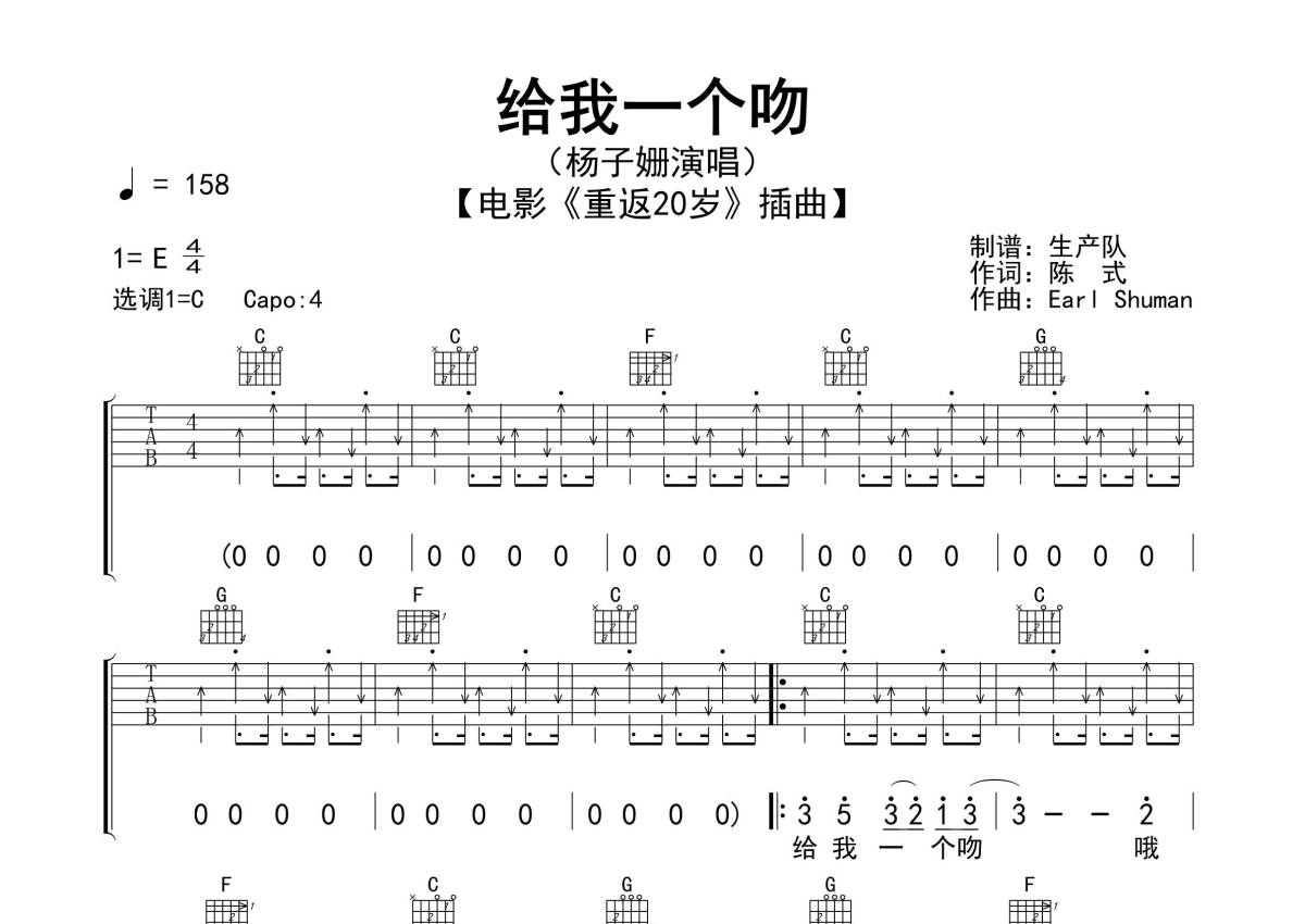 《给我一个吻》是杨子姗演唱的一首歌曲,精编扫弦版,拍号为4/4拍,歌曲速度为每分钟158拍,歌曲原调为E调,但由于原调指法比较难,为了方便弹奏,本吉他谱采用的是C调指法编配,变调夹4品弹奏即为原调,当然也可以根据自己的音域改变变调夹位置,或者通过改变和弦调性,以方便自己弹奏,这份吉他谱共有三张高清图谱,图谱由 @生产队 编配上传,图谱使用六线谱编配,包含吉他和弦指法、简谱以及歌词部分,使用这份给我一个吻吉他谱,可以让你更加方便地掌握这首歌曲的弹唱技巧,快来尝试吧。歌曲《给我一个吻》,是由杨子姗演唱的歌曲,也是电影《重返20岁》的插曲。本吉他谱根据原版采用C调指法编配,完整的前奏、间奏、尾奏编配,注意本曲的扫弦节奏要有Swing摇摆的味道!值得推荐学习的一首经典歌曲!。