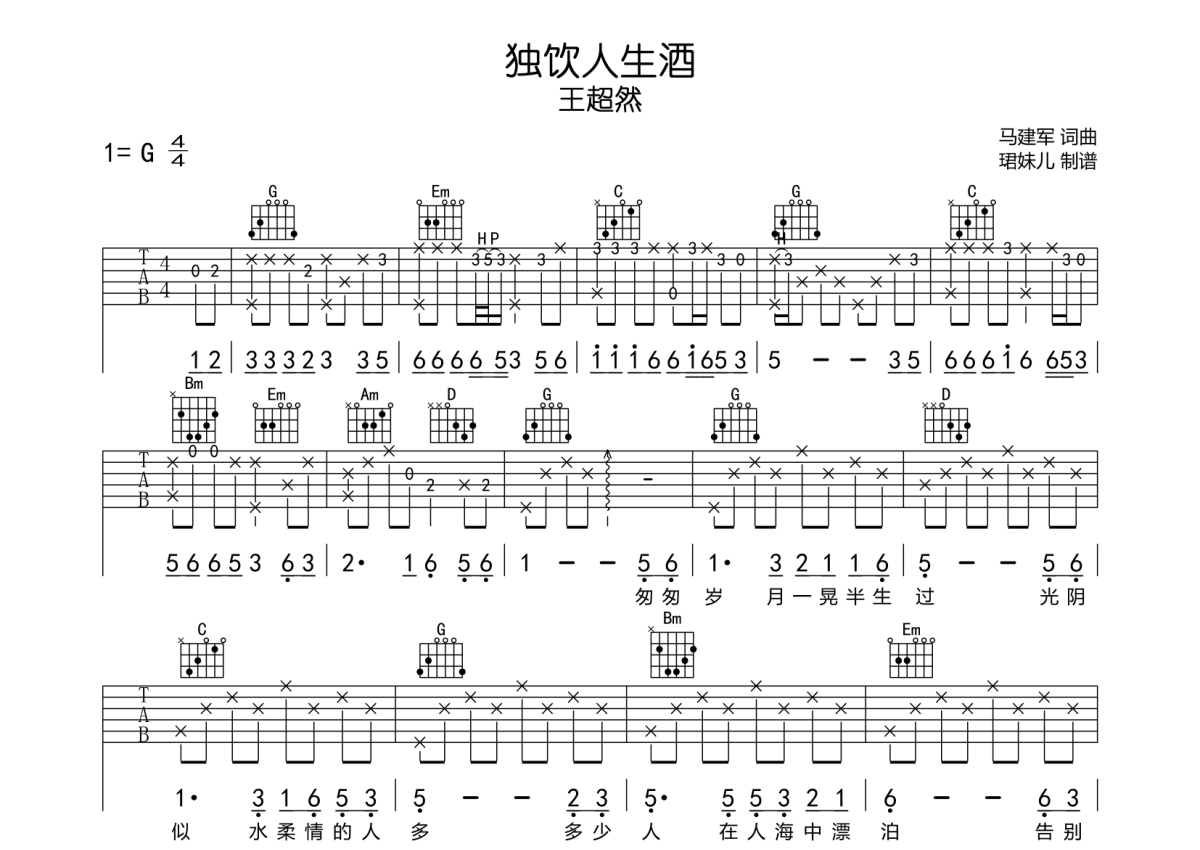 王超然《独饮人生酒》吉他谱 - G调弹唱六线谱
