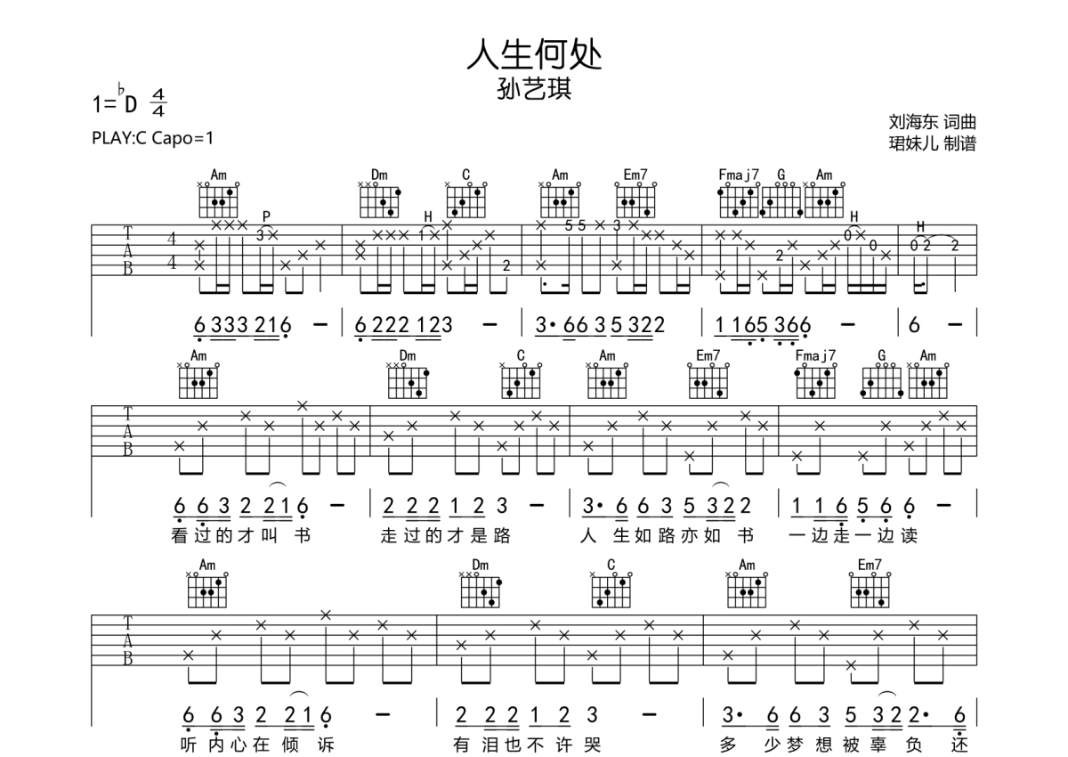 孙艺琪《人生何处》吉他谱 - C调弹唱六线谱