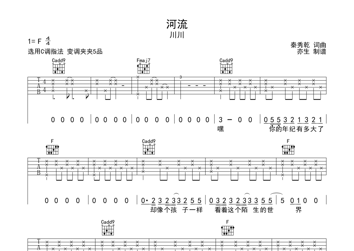 川川《河流》吉他谱 - C调弹唱六线谱