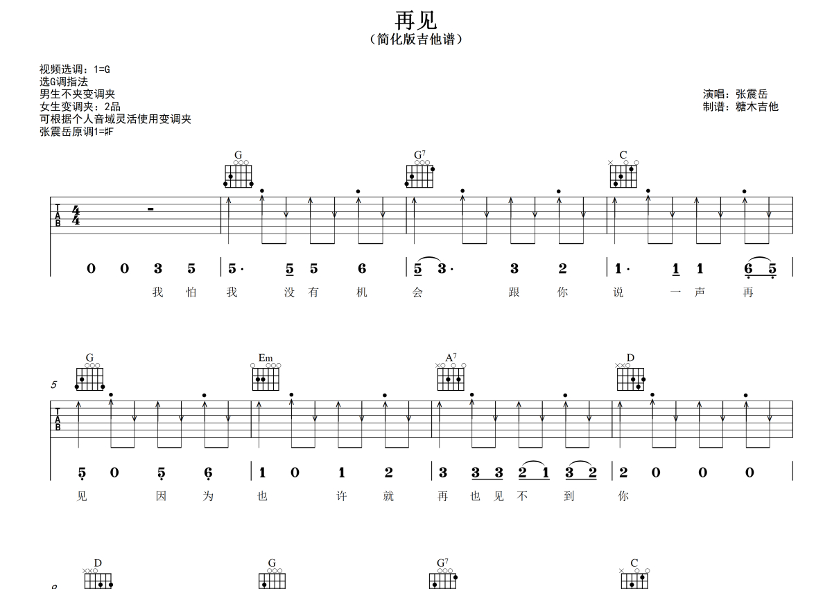 《再见》是张震岳演唱的一首歌曲,拍号为4/4拍,歌曲原调为G调,本吉他谱采用的是G调指法编配,演奏时不需要使用变调夹即为原调,这份吉他谱共有四张高清图谱,图谱由 @糖木吉他 编配上传,图谱使用六线谱编配,包含吉他和弦指法、简谱以及歌词部分,使用这份再见吉他谱,可以让你更加方便地掌握这首歌曲的弹唱技巧,快来尝试吧。对新手超友好的简化版吉他弹唱谱《再见》 张震岳G调指法版 谱曲对应视频示范以及音频示范都可在抖音搜索(糖木吉他)观看 想要更多吉他谱,可在抖音和小红书搜索关注“糖木吉他” 或者添加老师微信“Tangmu2867 ”来获取更多简单弹唱的吉他谱和弹唱视频。